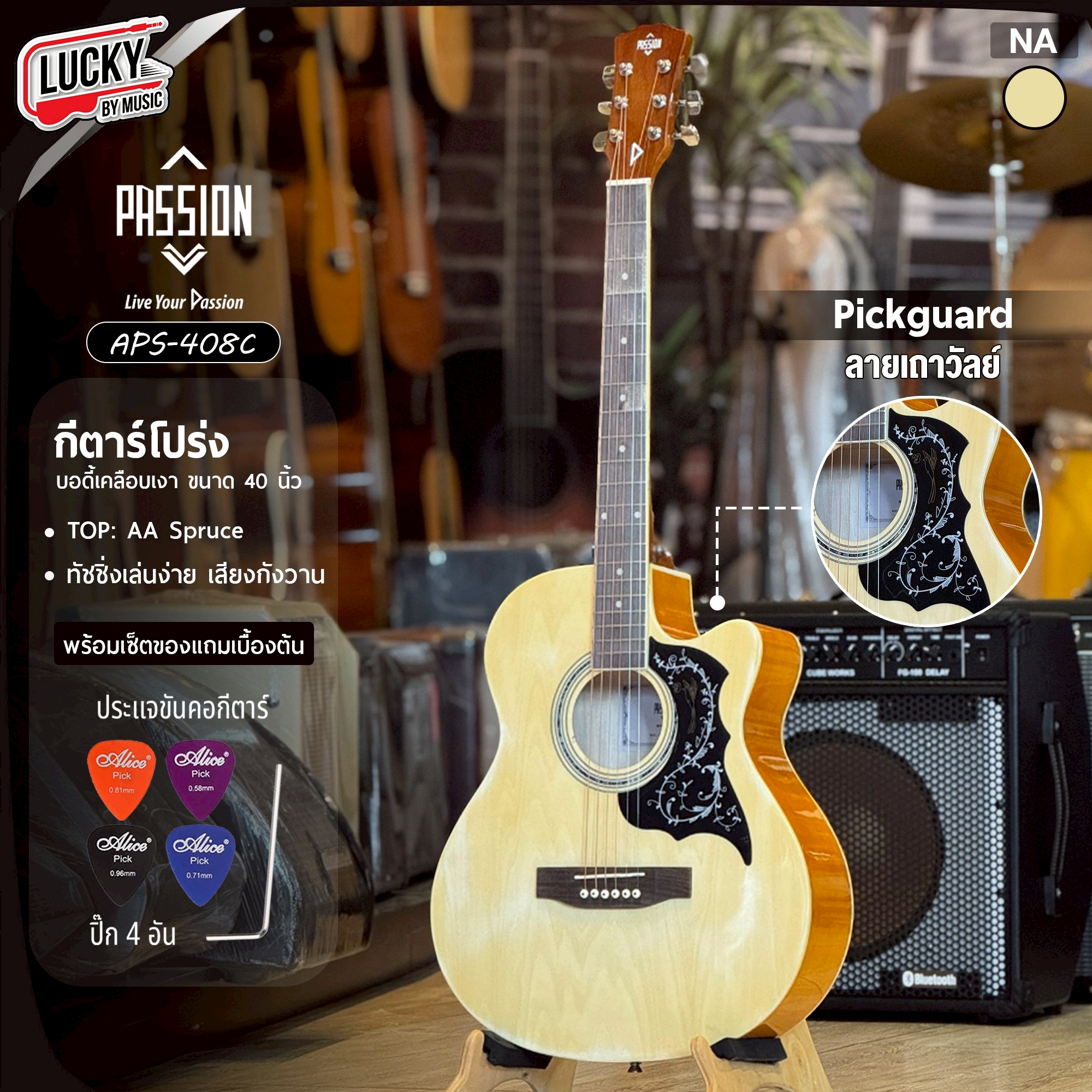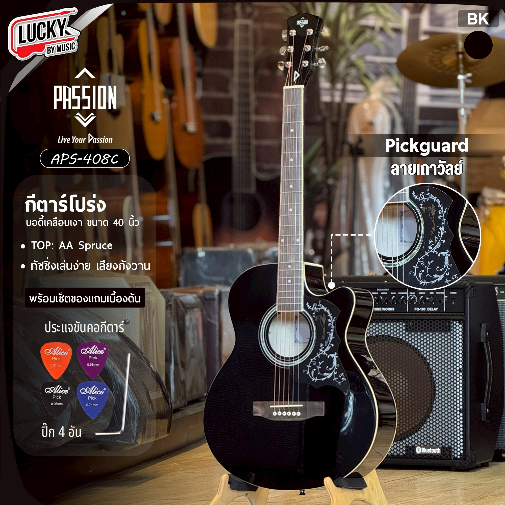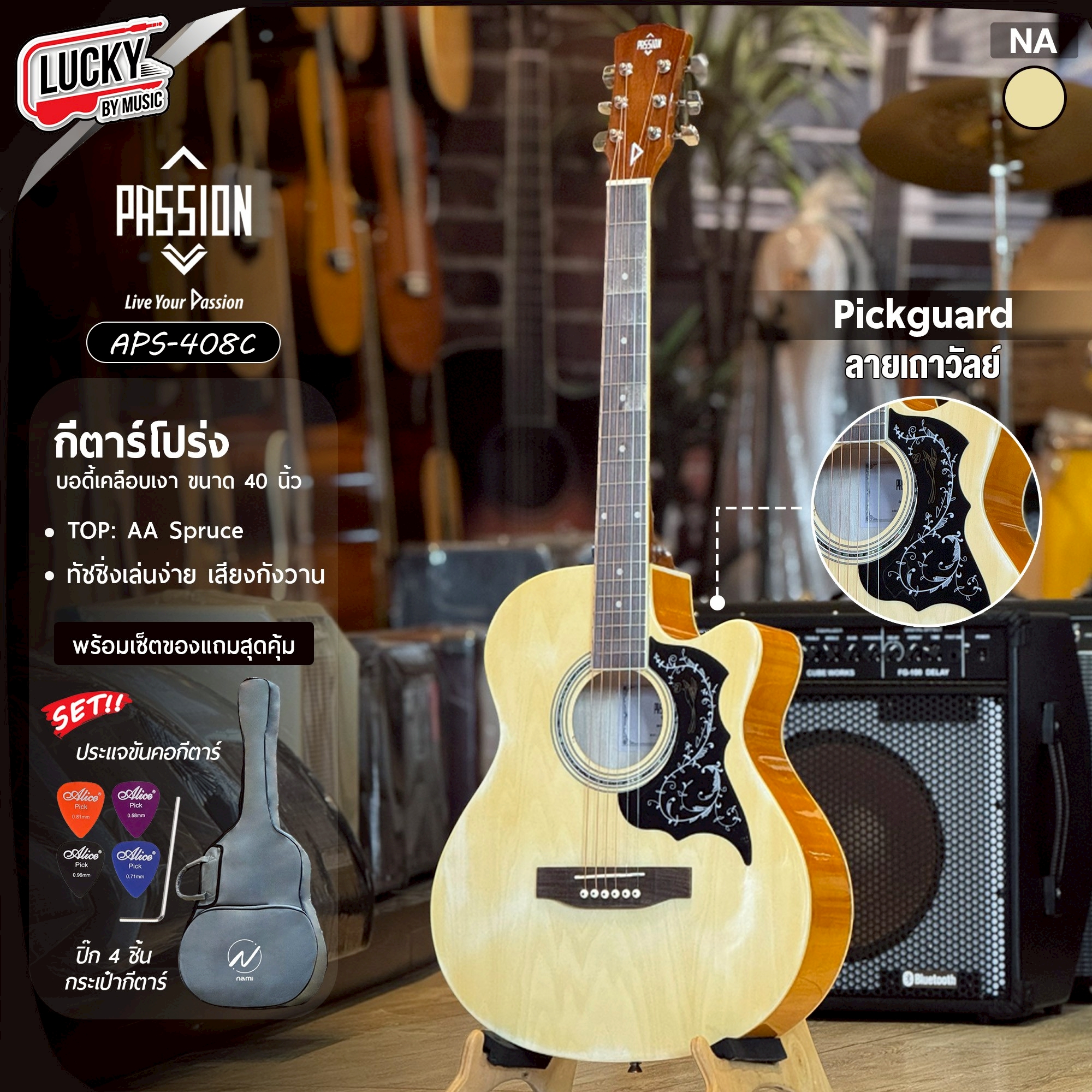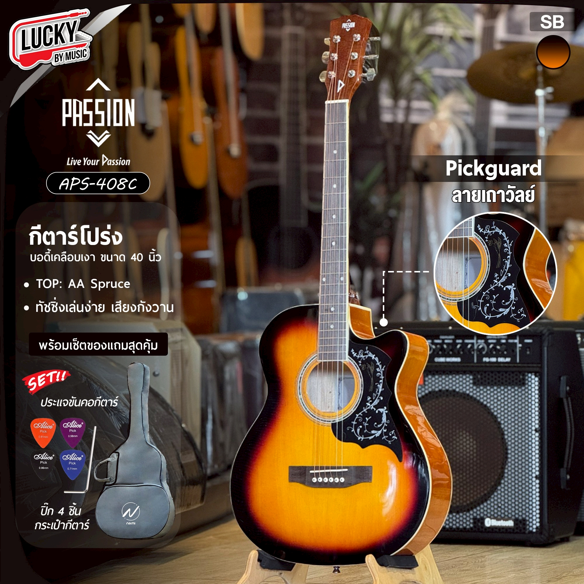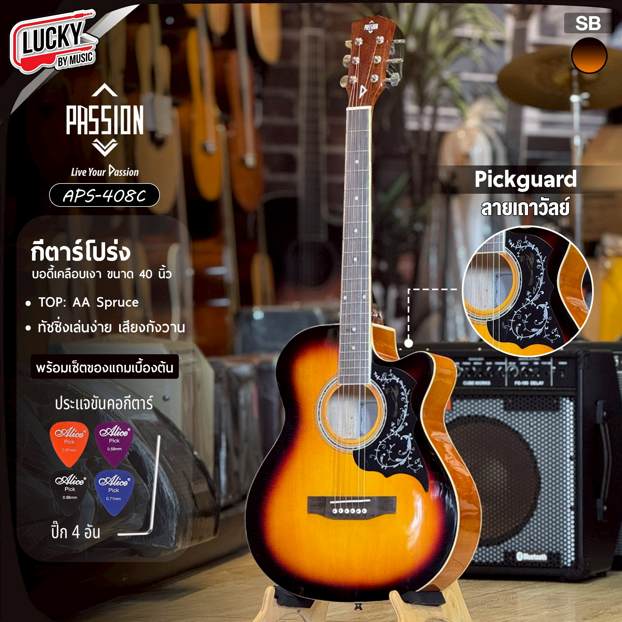 PASSION APS-408C กีตาร์โปร่ง บอดี้เคลือบเงา ขนาด 40 นิ้ว สีไม้ / สีดำ / สีซันเบิร์ส pickguard ลายเถาวัลย์
